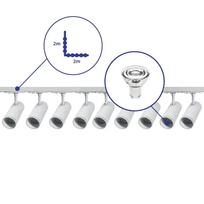 Komplettset 1-Phasen Rail L 2 x 2 Meter Weiß | incl. 9x Spot + GU10 2700K 3W Dimmbar + Abschlusskappe, Stromanschluss und L -Verbinder